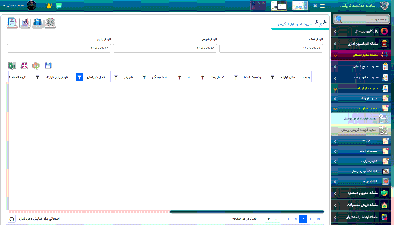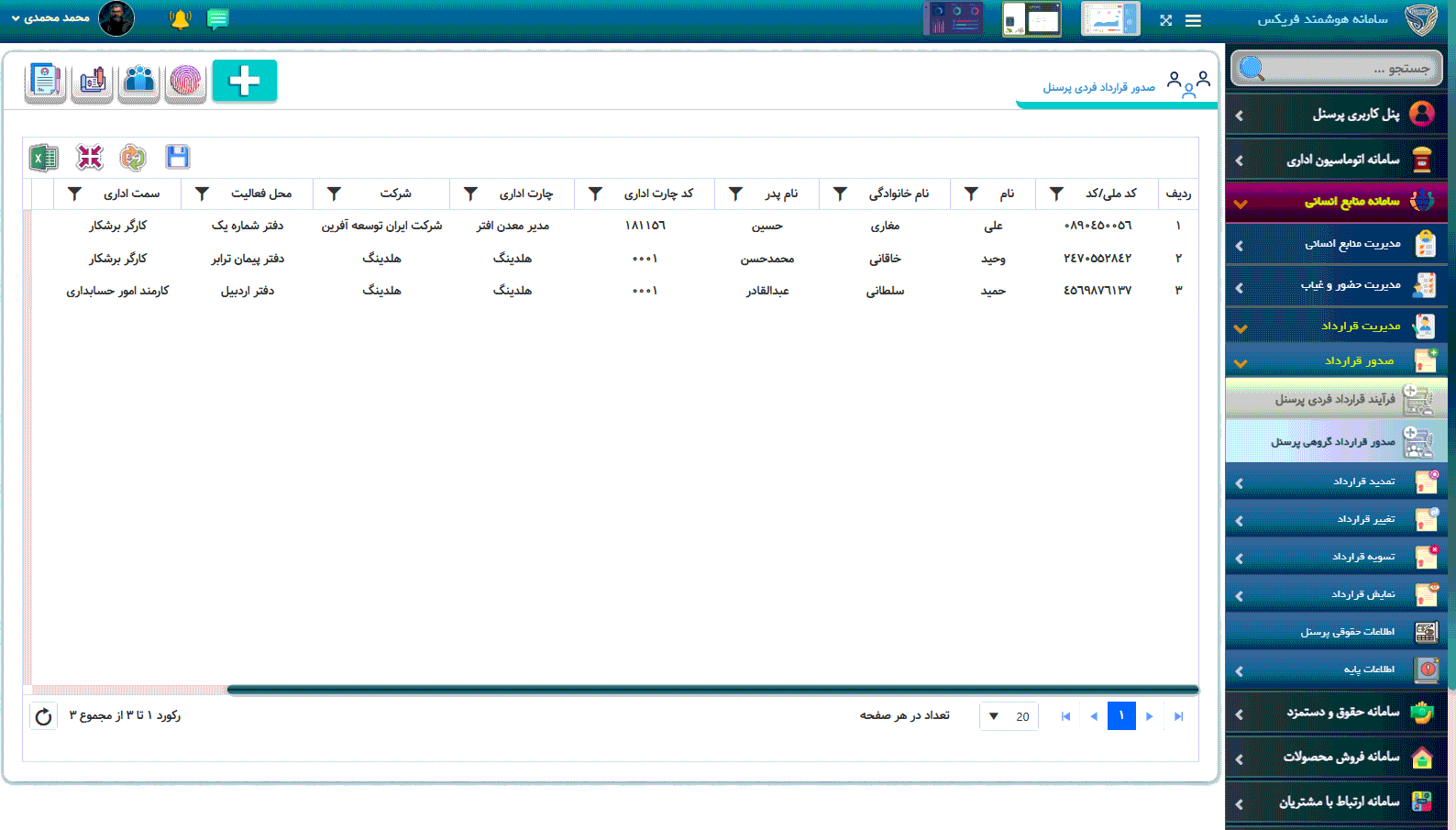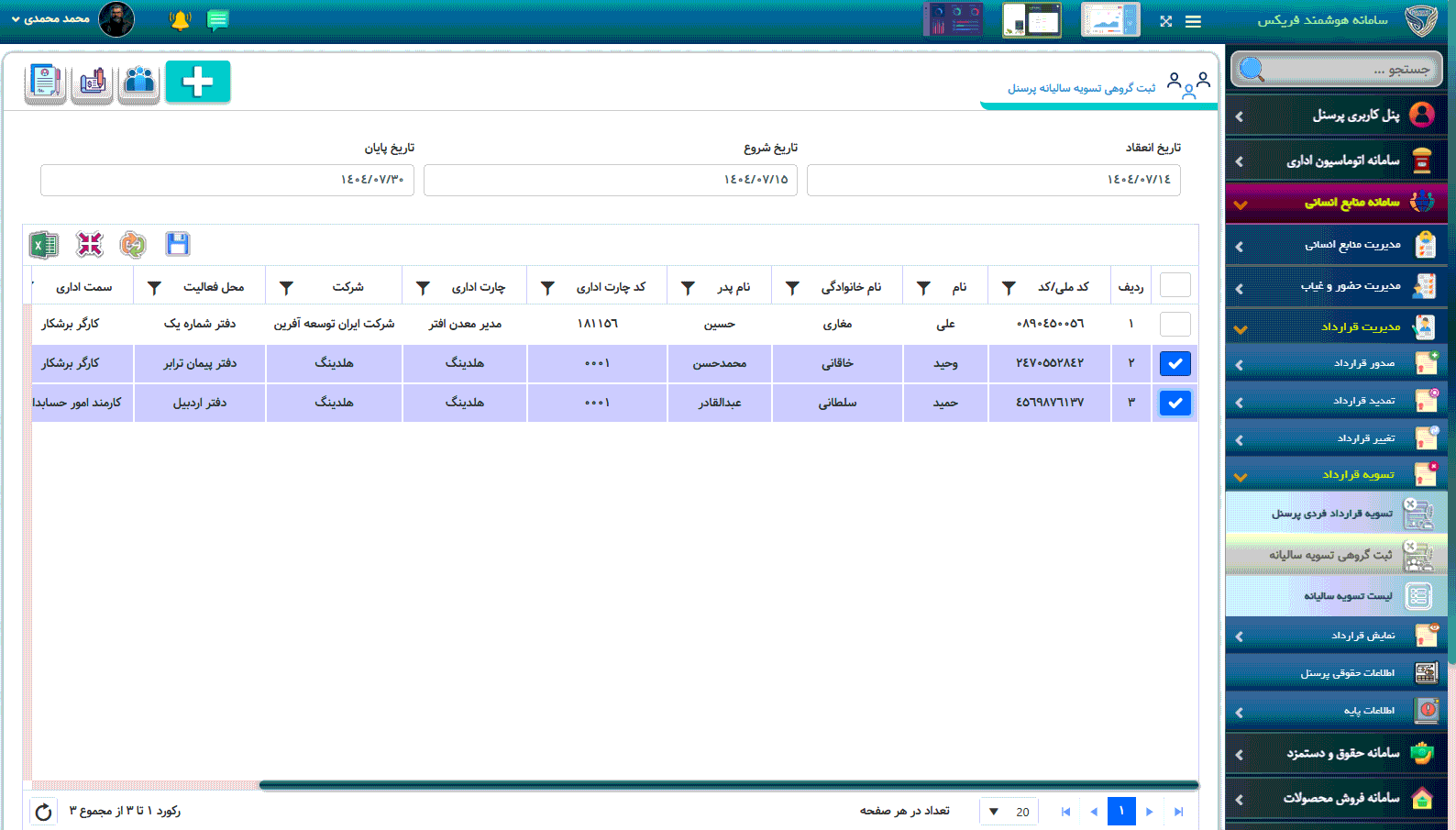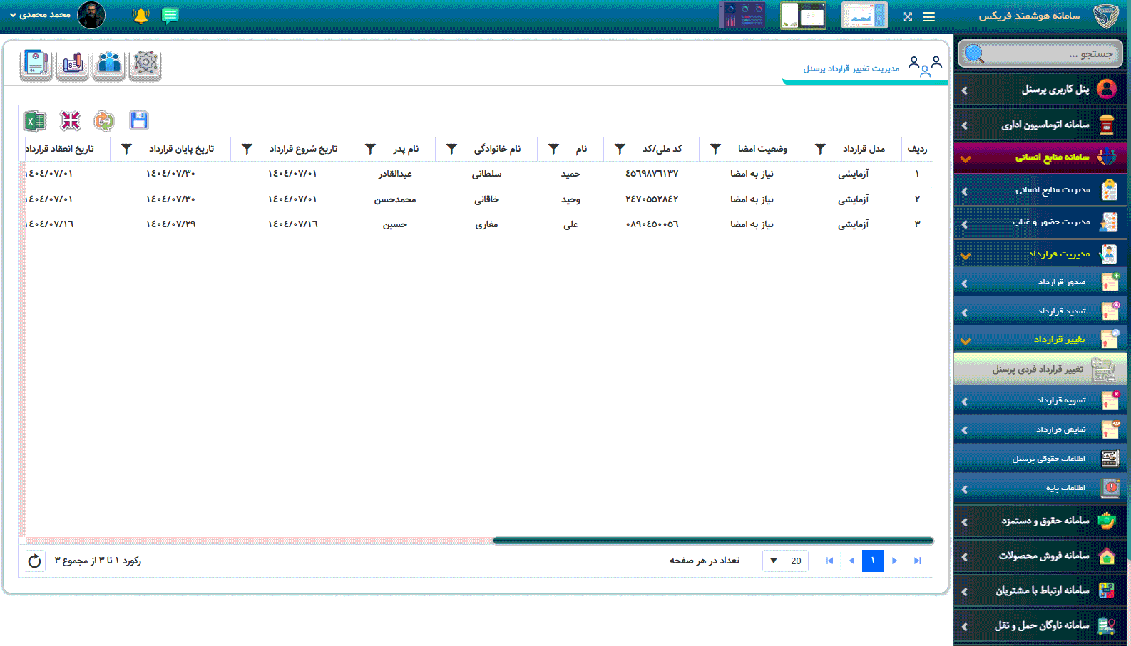 علاوه بر این، تمام سوابق قراردادهای قبلی، اصلاحات انجامشده و الحاقیهها در سامانه ذخیره شده و امکان گزارشگیری دقیق از وضعیت هر پرسنل یا واحد سازمانی فراهم است.