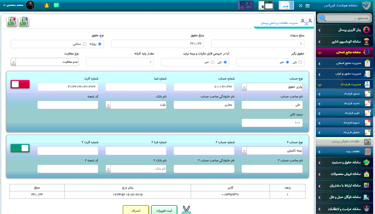تمامی تغییرات اعم از اصلاح حقوق، مزایا، سمت یا مدت قرارداد بهصورت متمرکز و قابل رهگیری در سامانه ثبت میشود. هر تغییر با تاریخ، کاربر انجامدهنده و شرح تغییر ذخیره شده و در سوابق پرسنلی قابل مشاهده است.
